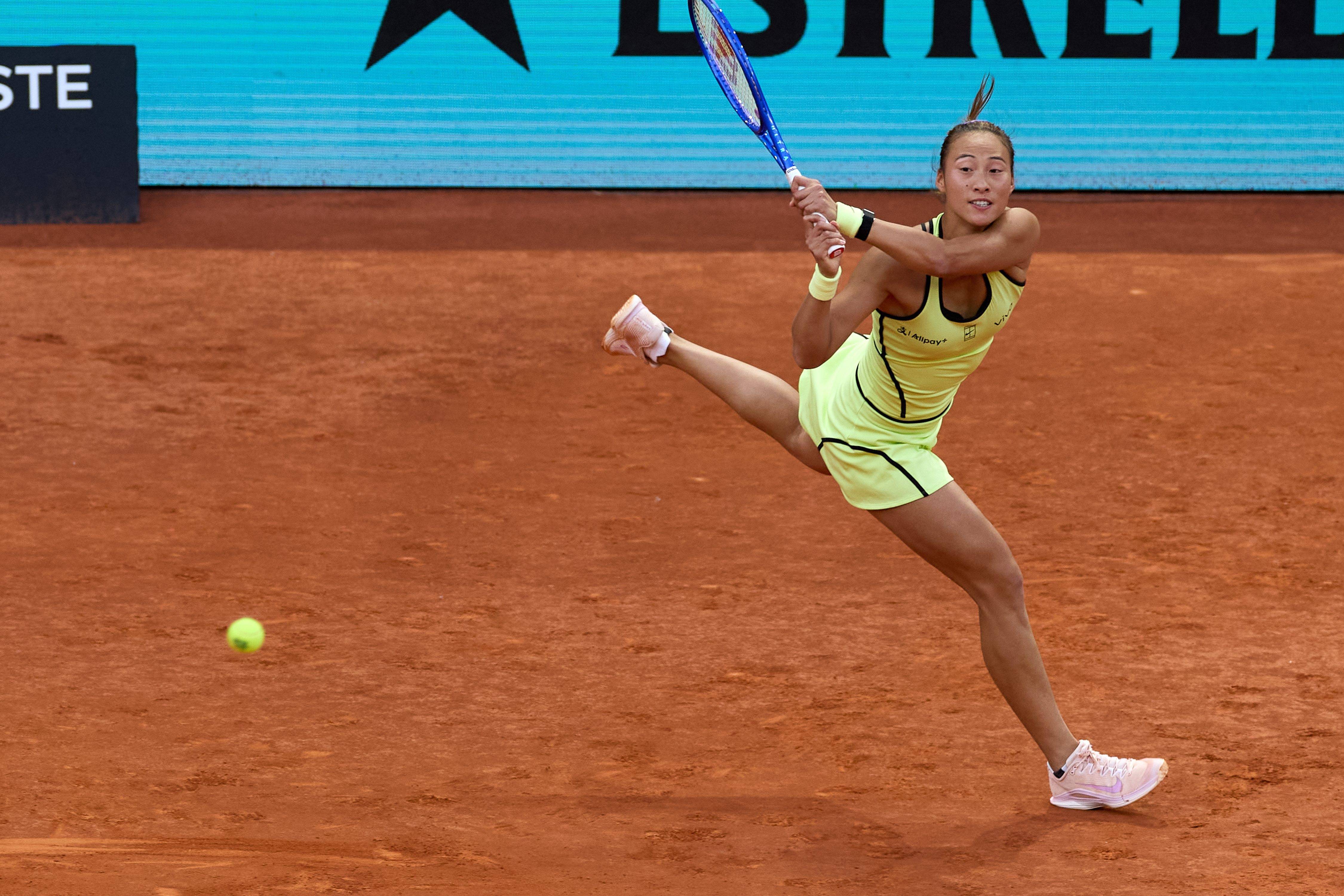 4月26日,郑钦文在比赛中回球。新华社记者 程敏 摄面对赛会二号种子、世界排名第二的哈萨克斯坦名将莱巴金娜,郑钦文在首盘占据主动,在第五局破发后一路领先,以6:4先下一盘。